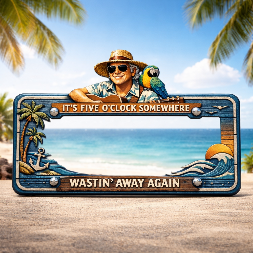 🌴🎸 Use this Jimmy License Plate Frame to cruise through life with island vibes and frozen-drink energy.